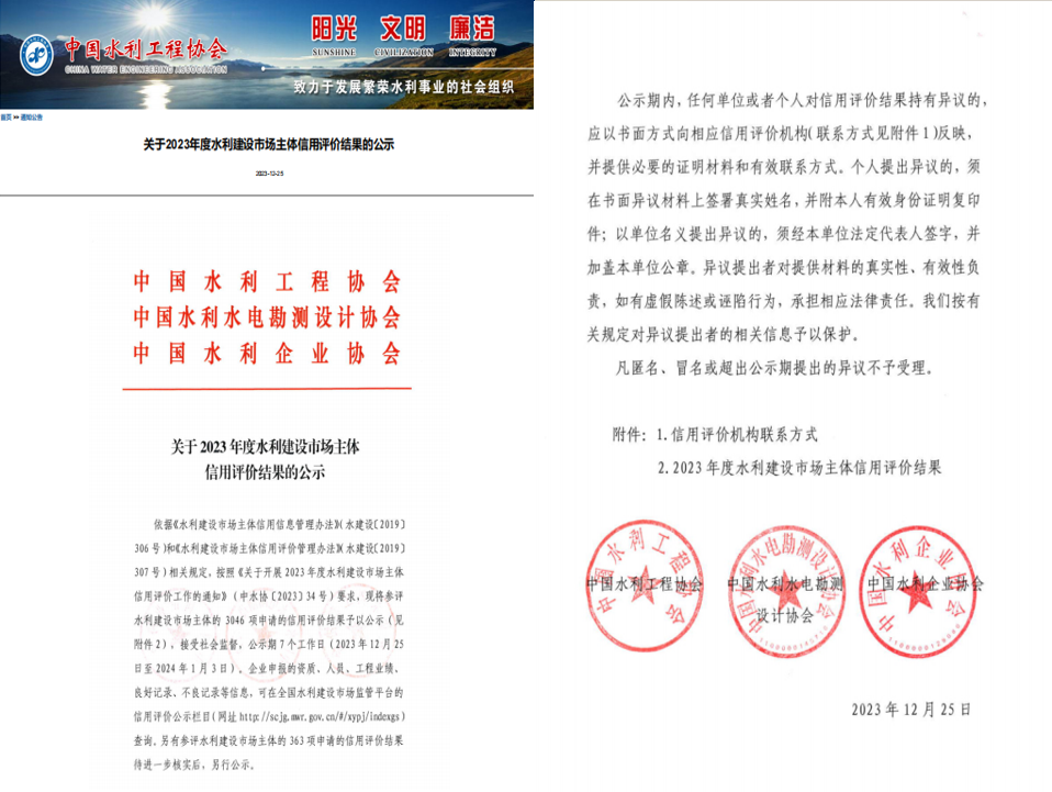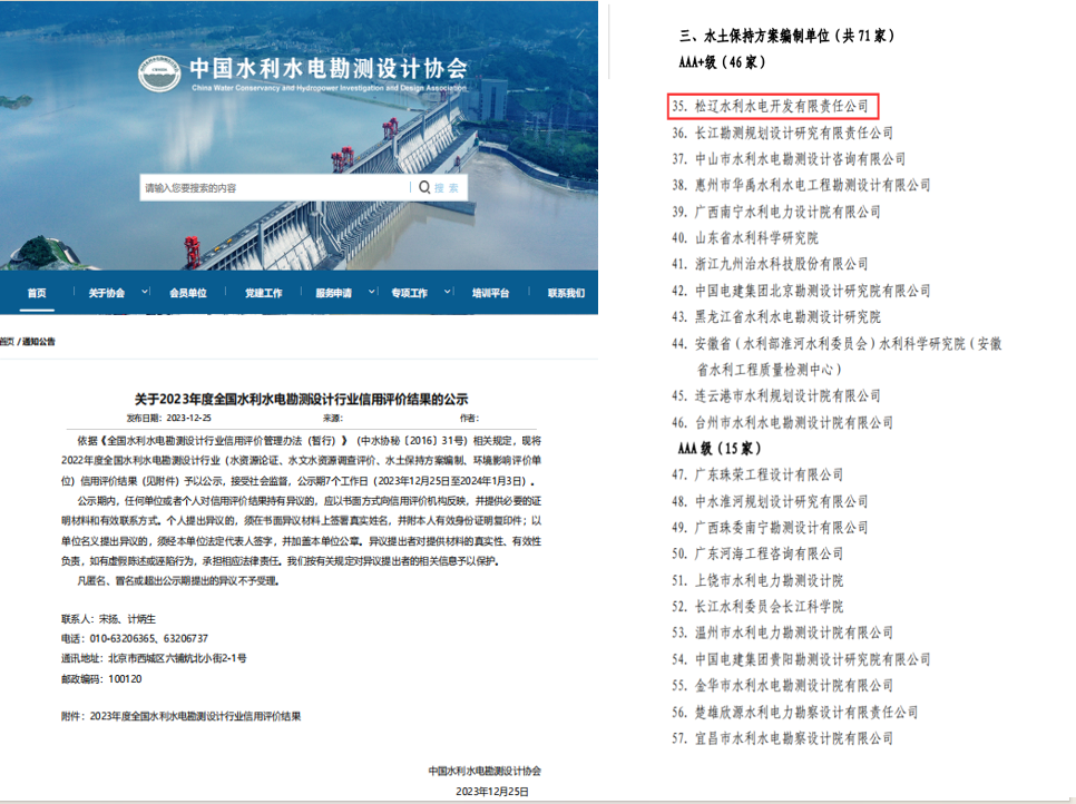 同時(shí),全國(guó)水利建設(shè)市場(chǎng)主體信用評(píng)價(jià)工作再添喜訊!經(jīng)中國(guó)水利工程協(xié)會(huì)核準(zhǔn),公司施工類信用評(píng)價(jià)取得AAA級(jí)。經(jīng)中國(guó)水利水電勘測(cè)設(shè)計(jì)協(xié)會(huì)核準(zhǔn),公司水土保持方案編制類信用評(píng)價(jià)取得AAA+級(jí)、設(shè)計(jì)類信用評(píng)價(jià)取得AA級(jí)、咨詢類信用評(píng)價(jià)取得AA級(jí)。在總體保持了各領(lǐng)域原有信用等級(jí)的基礎(chǔ)上,水土保持方案編制類由原來(lái)的AAA級(jí)榮升AAA+級(jí),是公司在信用評(píng)價(jià)工作中取得的新突破。