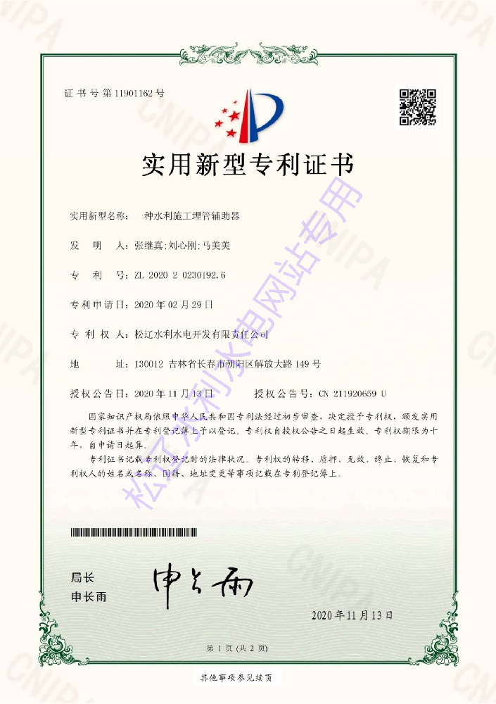 2020年11月取得“一種水利施工埋管輔助器”實(shí)用新型專利證書